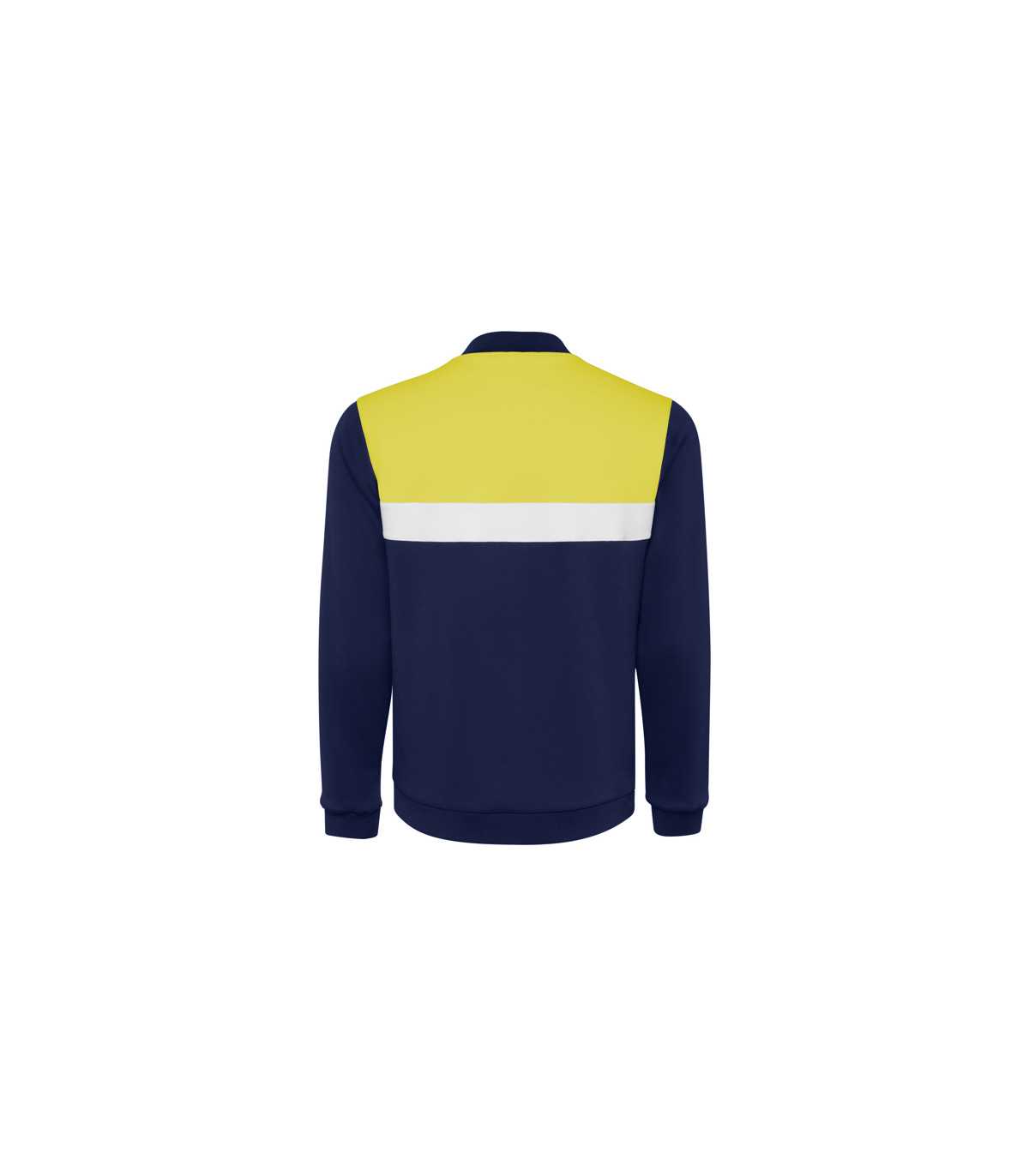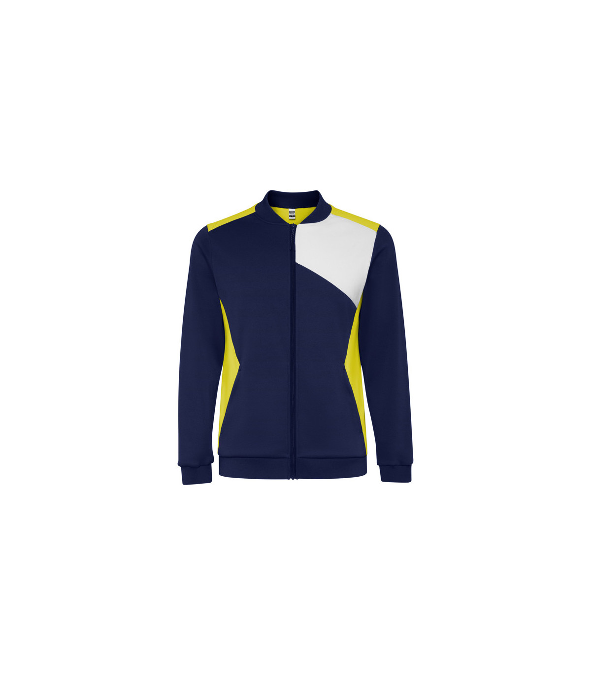 Chaqueta deportiva con cierre frontal de cremallera. Bolsillos laterales con cremallera. Cuello, puños y bajo con Rib 1x1. Pieza principal asimétrica en el pecho izquierdo especial para bordados. Combinable con pantalón RODAS.